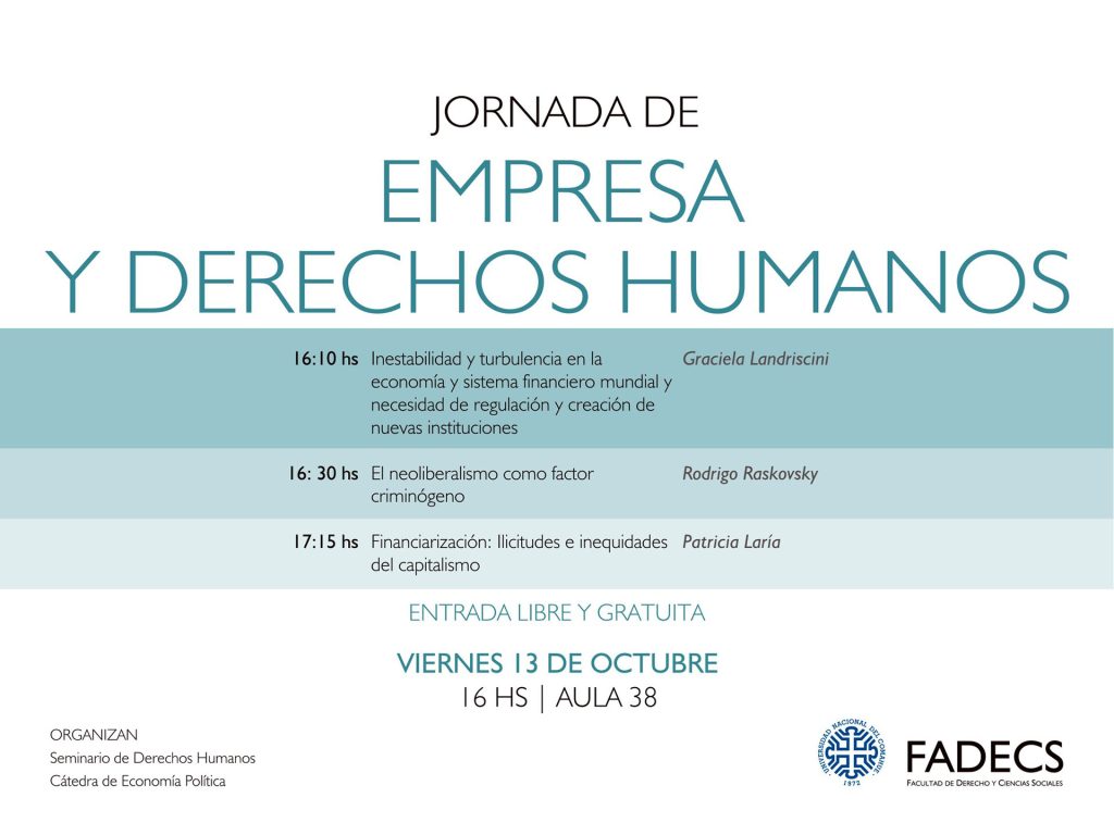 El Seminario de Derechos Humanos y la Cátedra de Economía Política de la FADECS organizan una «Jornada de Empresa y Derechos Humanos» este viernes 13 de octubre a partir de las 16 en el aula 38 de la casa de estudios .