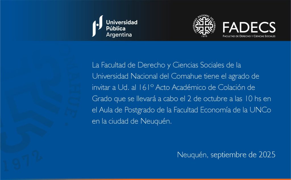 La Facultad de Derecho y Ciencias Sociales de la Universidad Nacional del Comahue informa que el 161º Acto Académico de Colación de Grado y de Posgrado se llevará a cabo el viernes 3 de octubre de 2025 a las 9:30, en el auditorio de esta casa de estudios.