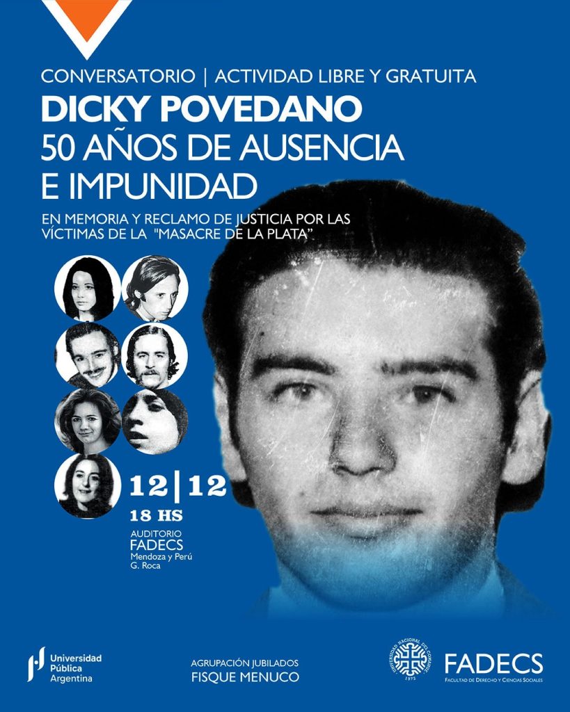 La Agrupación Jubilados Fisque Menuco realizará un acto recordatorio en memoria y reclamo de justicia por Enrique Carlos «Dicky» Povedano y todas las víctimas de la denominada «masacre de La Plata», al cumplirse en 2025 los 50 años de estos actos de terrorismo de Estado. La conmemoración será el viernes 12 de diciembre de 2025 a las 18 en el aula Auditorio, y contará con la participación de panelistas, familiares de Enrique, trabajadoras de ANSES y las referentes en derechos humanos Ana Calafat y Silvia Barco.