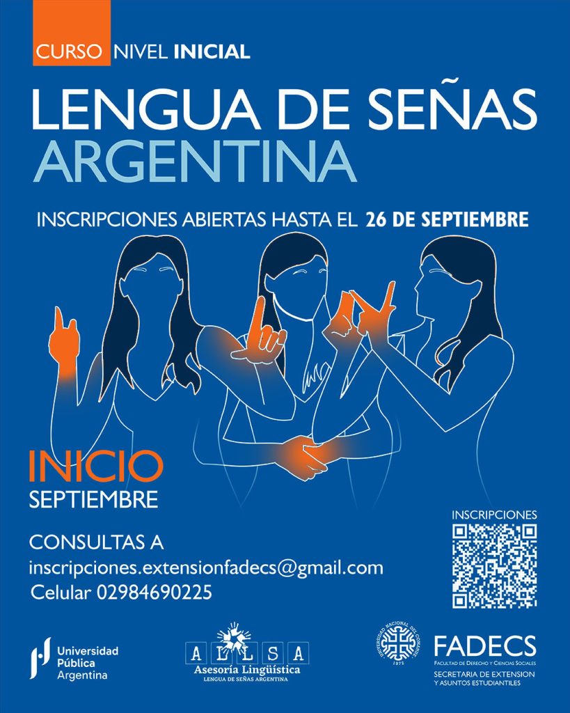 La Secretaría de Extensión de la Facultad de Derecho y Ciencias Sociales informa que se abrirá una convocatoria para la segunda cohorte del Curso de Lengua de Señas Argentina Nivel Inicial, Intermedio y Avanzado. El curso será dictado por el instructor referente sordo Norberto Ibarra (instructor universitario en Lengua de Señas Argentina) y Mayra Yañez […]