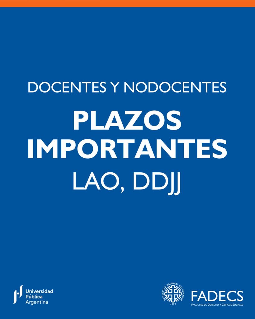 Mediante Resolución Decanal N°0682/2025 se aprobó el calendario académico 2026 para la Facultad de Derecho y Ciencias Sociales, según el Anexo Único que a continuación se transcribe: ANEXO ÚNICO ACTIVIDADES ACADÉMICAS 2026 Segundo período Inscripción: 2026 2/2 al 27/2/2026 Jornadas de Introducción a la Vida Universitaria y Nivelación Académica: 25/2 al 6/3/2026 Reinscripción a Carreras: […]