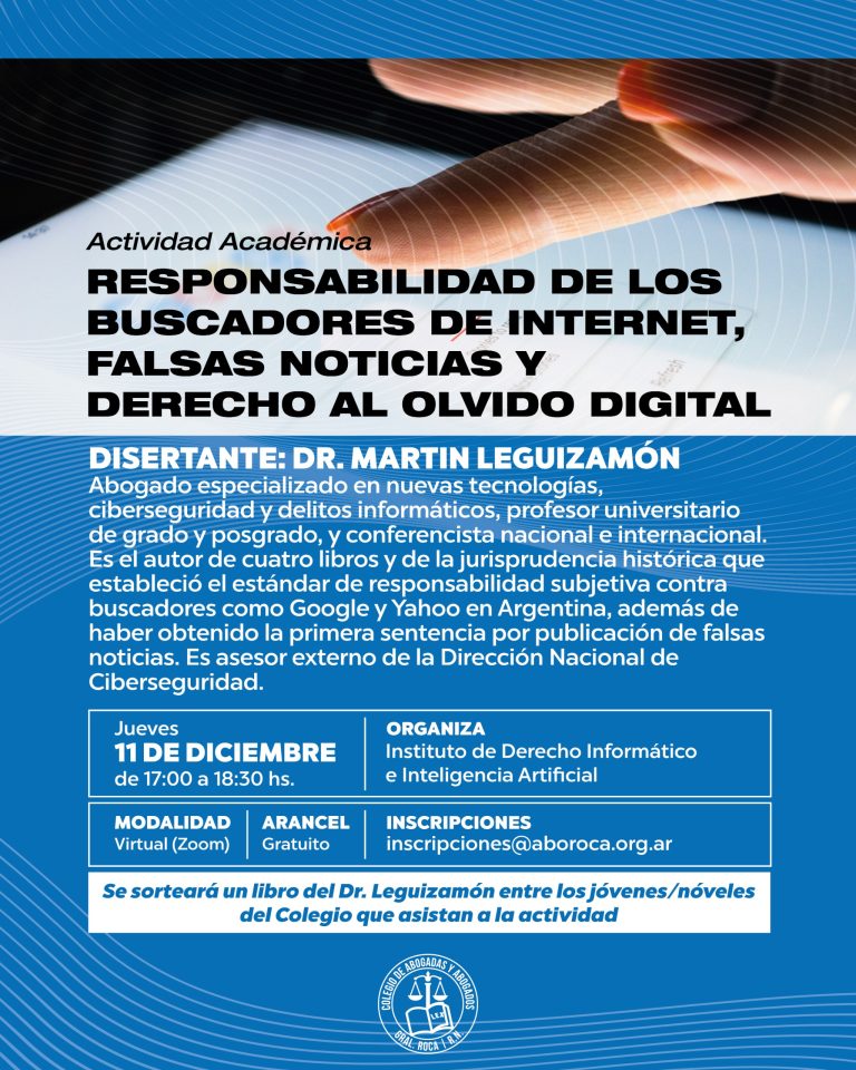 El Colegio de Abogadas y Abogados General Roca y el Instituto de Derecho Informático e Inteligencia Artificial invita a abogados/as y al público interesado a