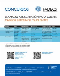 Informes desde el 17/10/2025 | Departamento Docente de FADECS concursos@fadecs.uncoma.edu.ar | concursos@fade.uncoma.edu.ar Whatsapp 298 415-3062 INSCRIPCIONES desde el 24/10/2025 y hasta el 30/10/2025 inclusive. concursos@fadecs.uncoma.edu.ar
